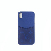 Brands new Cobalt monogram canvas and Taiga leather Louis Vuitton Taigarama iPhone Xs Max Bumper case featuring card slot at exterior and black Alcantara interior. Includes box and dust bag.